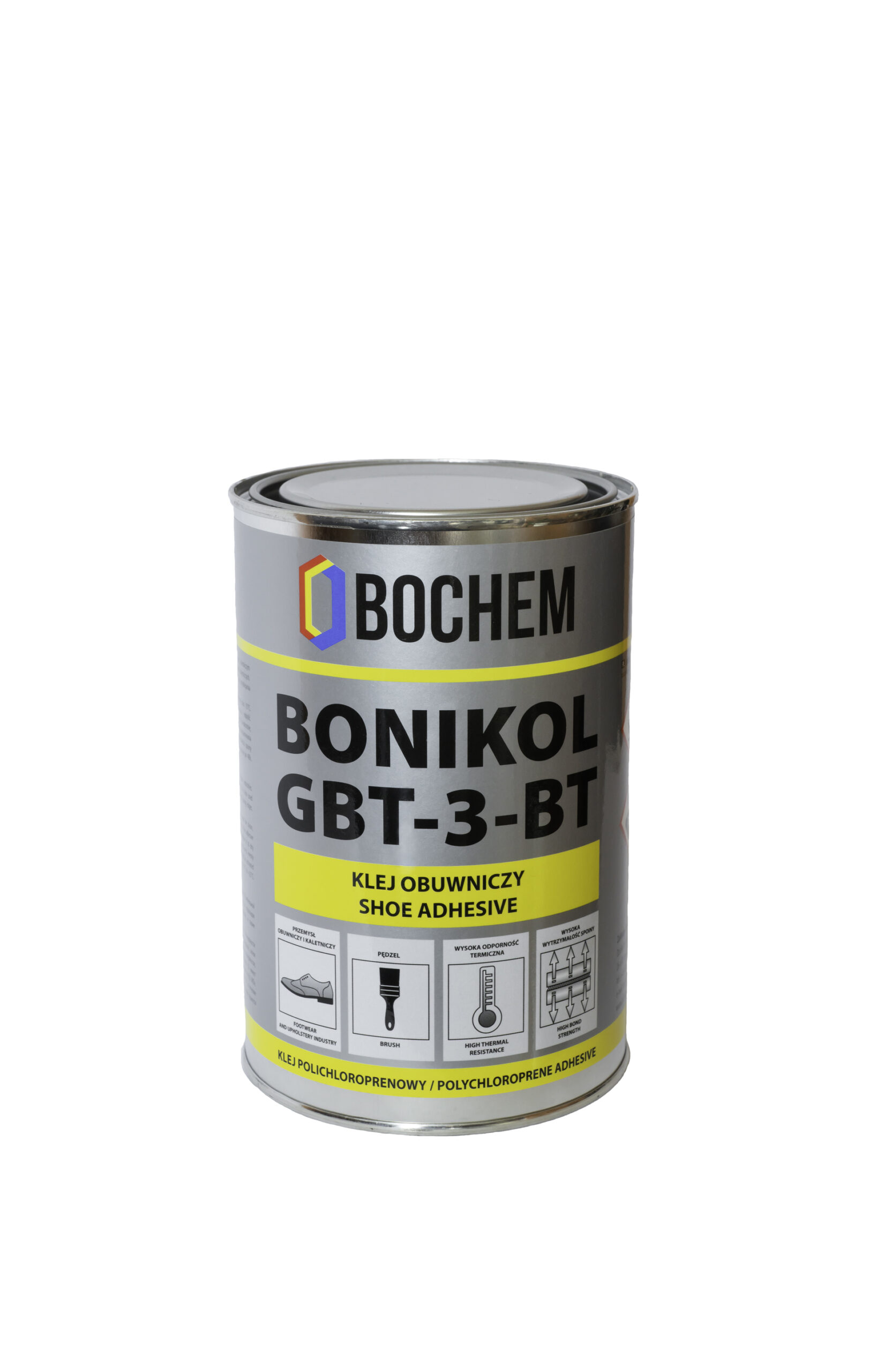 Jednoskładnikowy klej na bazie roztworu kauczuków polichloroprenowych w rozpuszczalnikach organicznych. Klej stosowany jako klej pomocniczy w przemyśle obuwniczym, kaletniczym oraz meblarskim. Bonikol GBT-3 posiada pozytywną ocenę CLPO w Krakowie oraz PZH w Warszawie do stosowania w przemyśle obuwniczym.