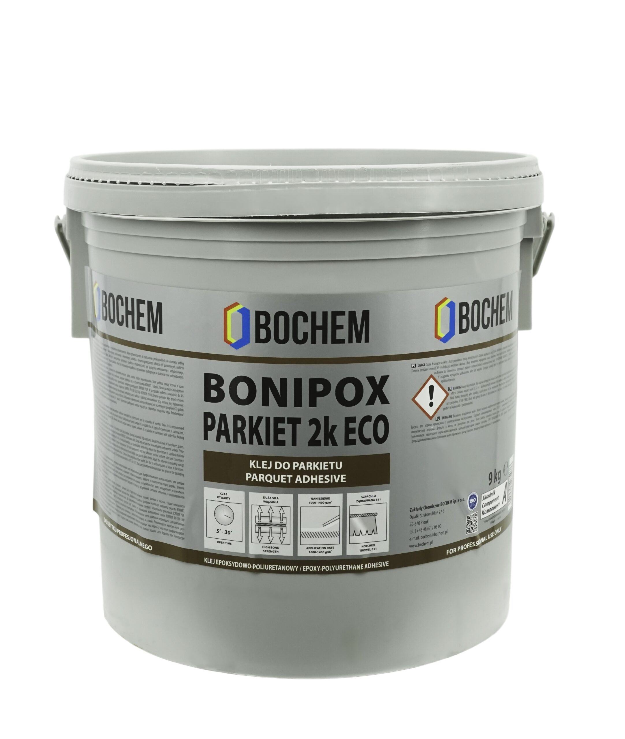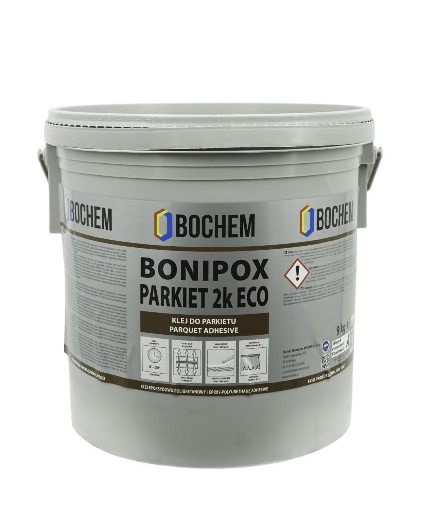 Klejenie parkietu: klej przed użyciem należy doprowadzić do temperatury pokojowej. Oba składniki kleju dokładnie wymieszać (do uzyskania jednolitej masy i koloru) i nakładać równomiernie przy pomocy pacy ząbkowanej (zalecana B11). Zaleca się nakładać klej jednorazowo na powierzchnię, na której można ułożyć parkiet w czasie do 30minut. Klepkę parkietową położyć, lekko przesunąć, a następnie silnie docisnąć do podłoża. Szlifowanie i lakierowanie parkietu można rozpocząć nie wcześniej niż po upływie 72 godzin od zakończenia robót, przy czym z uwagi na aklimatyzację drewna w pomieszczeniu zaleca się wykonanie szlifowania po najmniej 14 dniach. Ogrzewanie podłogowe można włączyć po całkowitym związaniu kleju.